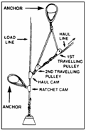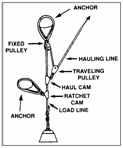 the pulley. The other leg is used to set the second 2:1 system through the pulley with the terminated line. A ratchet cam is added to allow the team