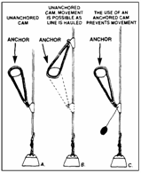 Figure B is the preferred method for hauling a live or critical load. In this system we have added a ratchet cam. The ratchet cam is used to hold the load when sufficient force is not being exerted on the unanchored end.