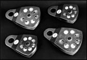 The cheeks (sideplates) of a rescue pulley must rotate on the axle allowing you to open the pulley and insert a rope into the pulley at any point along the rope. Pulleys with fixed cheeks must be threaded on from one end, a lot of fun when you have 150 feet of spaghetti at your feet. Pulleys are frequently used as directionals, and in this application it is not uncommon for the pulley to rub against a building or cliff, possibly abrading or damaging the rope if it is exposed. Cheeks that extend beyond the rope in the pulley will help to reduce the chance of this occurring. Axles should be made of steel, for high strength and good wearing characteristics. Axle bolt heads should have a low profile rounded shape to avoid snagging on ropes, rocks, shingles, etc.
