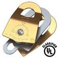 A 4(10.3cm) triple sheave pulley with rotating sideplates. Designed for ropes through 5/8(16mm) diameter. Can be reaved at any point on the line. 5:1 triple over double block and tackle system possible when used in conjunction with a double sheave pulley with becket. High strength alloy aluminum construction. Oilite bushing. Triple carabiner rigging point. Exceeds NFPA, ANSI and OSHA specifications. Minimum tensile strength: 15,000 lbs.(6804kg). Pitch diameter: 3.5(9cm). Color: gold. Weight 2.5lbs.(1.1kg).